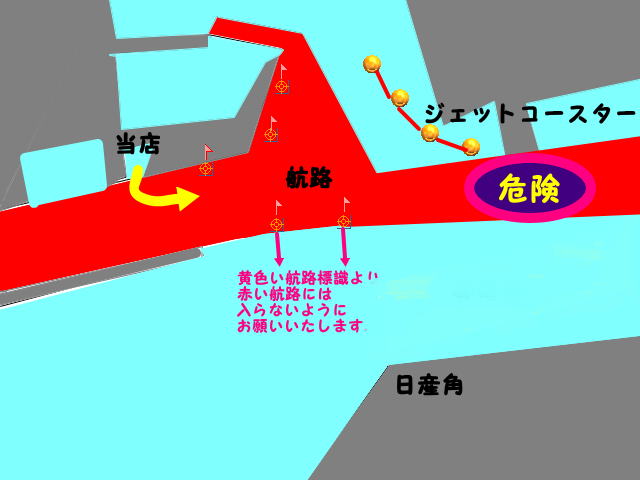 | 漁港、船の出入り口、航路での釣りは危険ですのでおやめください。 |